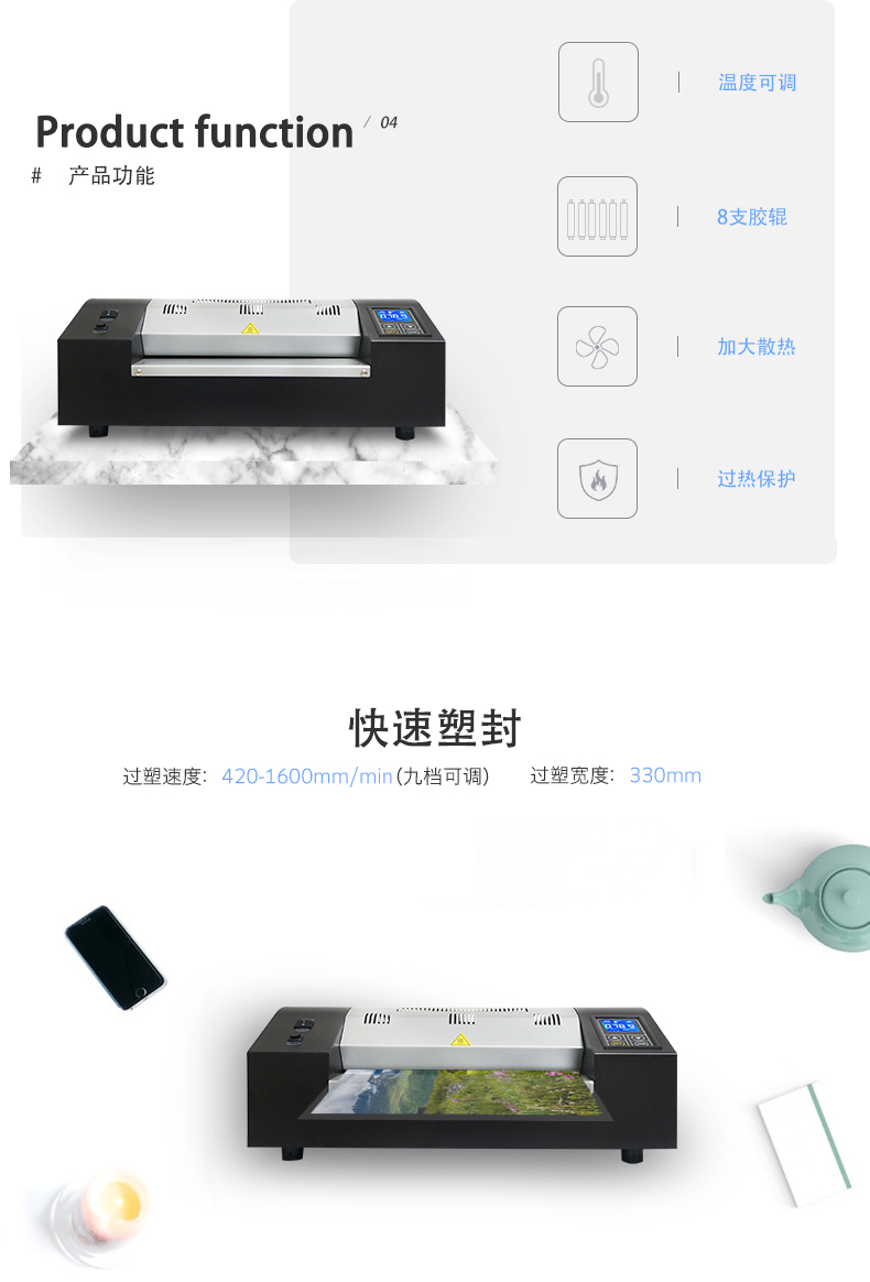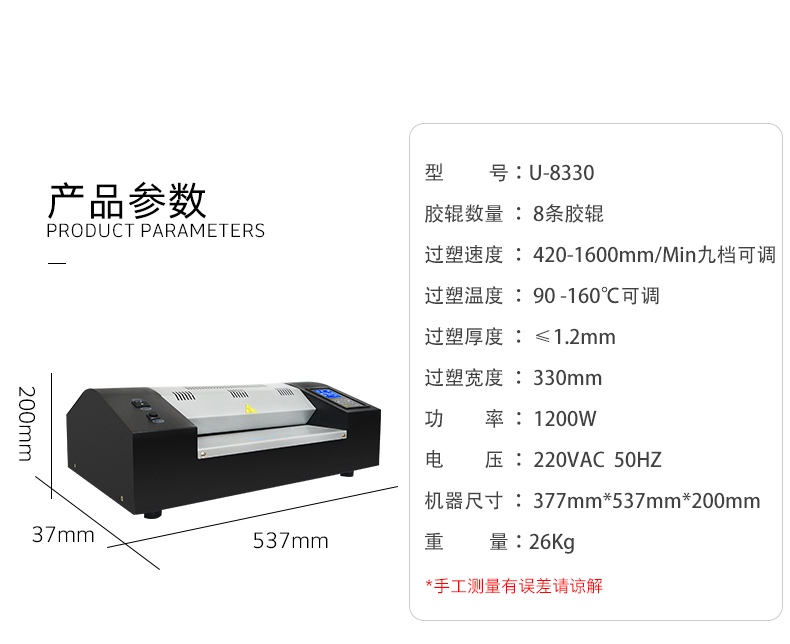 商品名称:优玛仕 U-8330 塑封机 独特的6胶辊可翻转设计 热塑、冷裱两用 有反转功能(计价单位:台)