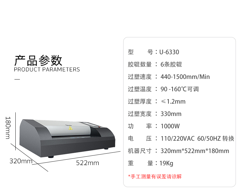商品名称:优玛仕 U-6330 塑封机 4辊A2幅面塑封机1台 独特的6胶辊可翻转设计 热塑、冷裱两用 有反转功能(计价单位:台)