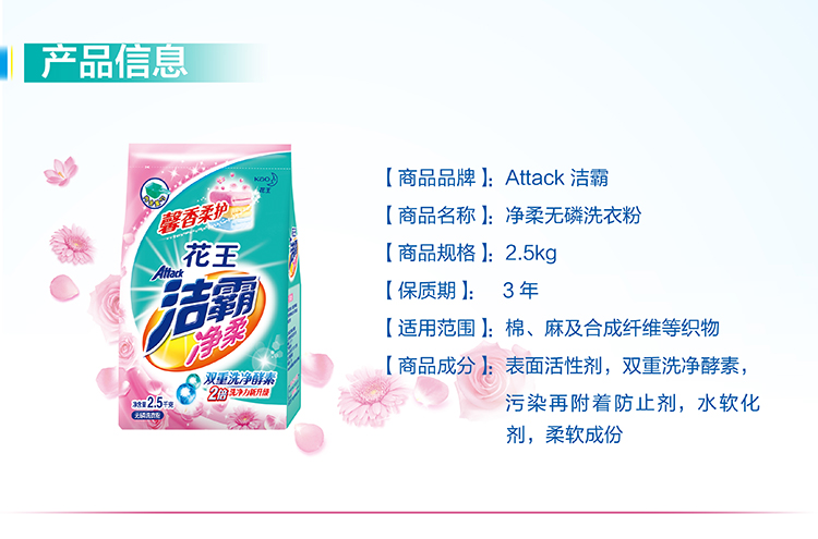商品名称:花王洁霸(ATTACK)净柔无磷洗衣粉 柔顺成分配方 2.5kg
