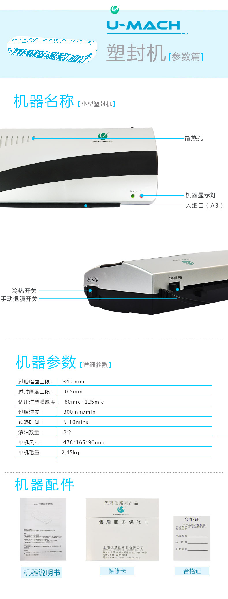 商品名称:优玛仕 U-340S A3 2辊塑封机(计价单位:台)