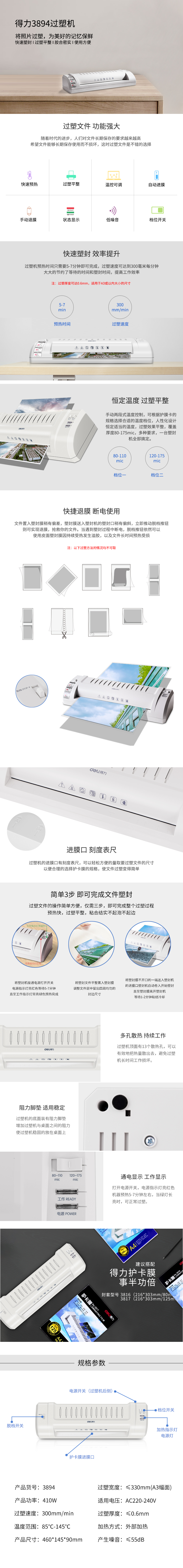 商品名称:得力 3894 塑封机 460*145*90mm 银灰色(计价单位:台)