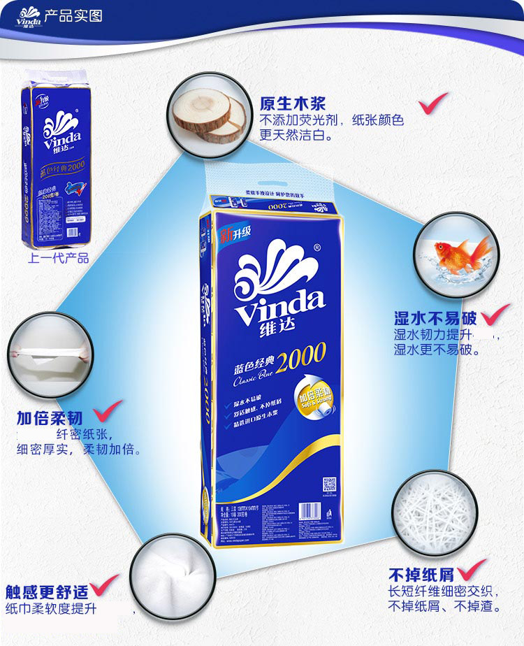 商品名称:维达 V4073 蓝色经典卷纸 4层 200g 10卷/提 x6条/箱 单位:提