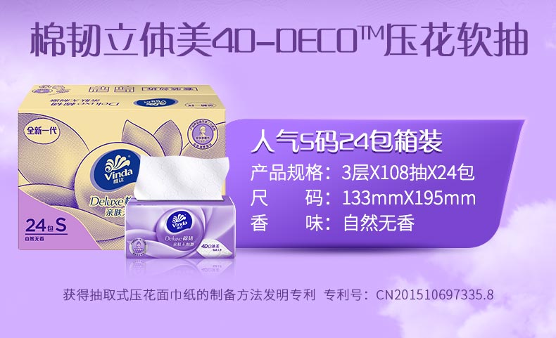 商品名称:维达(Vinda) 抽纸 立体美3层108抽软抽*24包(小规格 母婴可用) 整箱销售