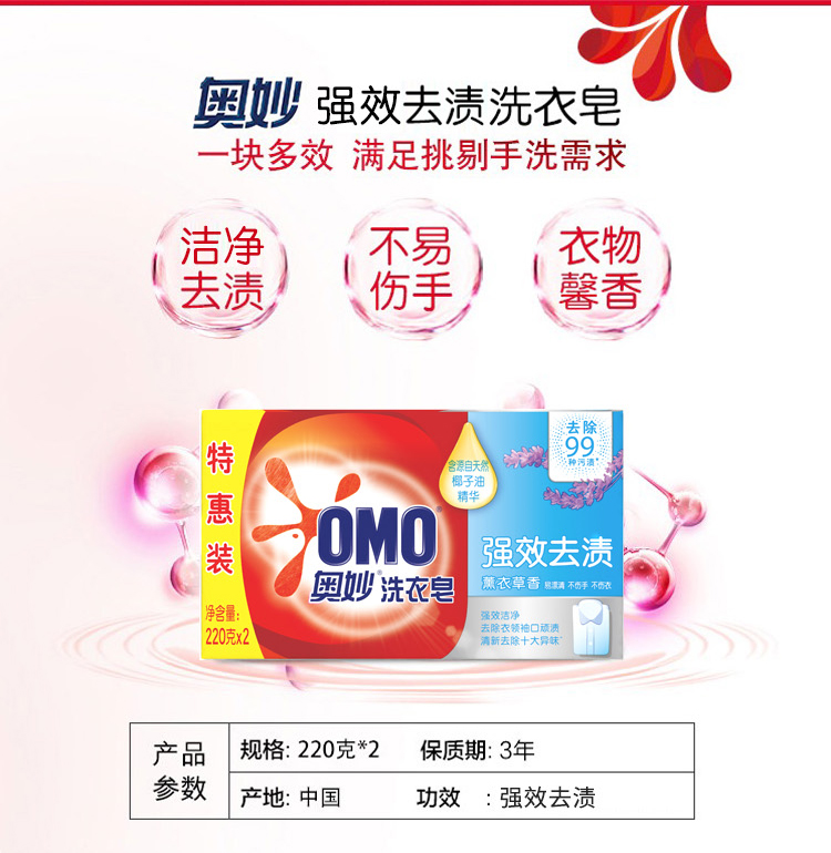 商品名称:奥妙(OMO) 强效洁净洗衣皂 薰衣草香型220g*2(新老包装随机发货)